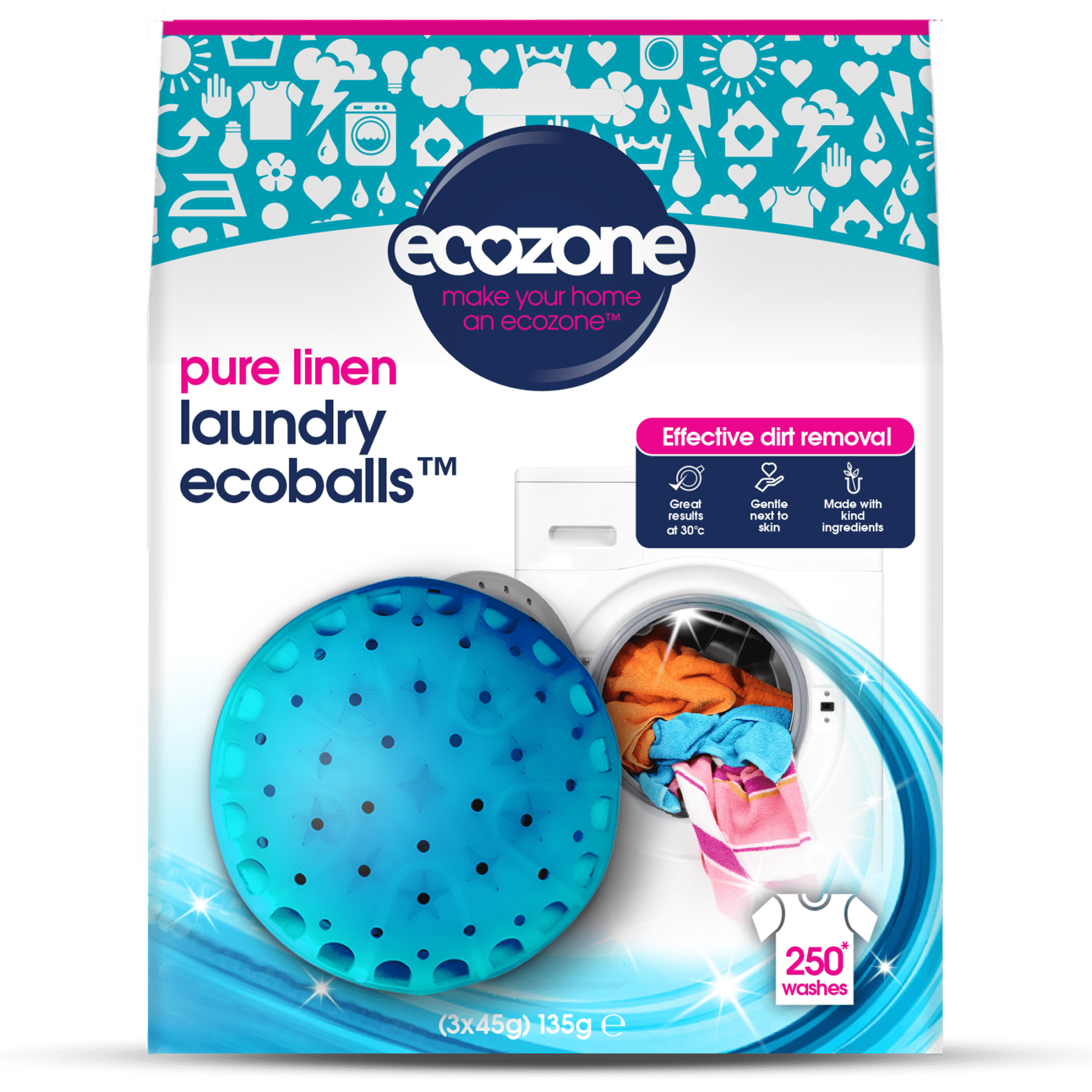 Ecozone Ecoballs™ 250 washes* are an innovative alternative to laundry detergent, be it liquid or tablets, designed by Ecozone over 20 years ago. How do they work? It’s simple; you fill the secure spherical casing with two types of pellets, made from a formulation of natural minerals (brown pellets) and cleaning agents (white pellets)**. Once the Ecoball is topped up, place it into the washing machine along with your clothes. The pellets then lift dirt from the material and provide an effective clean. The blue Ecoballs™ have a wonderfully fresh, pure linen fragrance, and are residue-free to be gentle next to skin. To add to their eco credentials, the Ecoballs™ effectively clean at cool temperatures (30°c) and can be used without a rinse cycle, which will help cut down on water use and wash time.