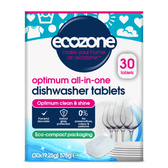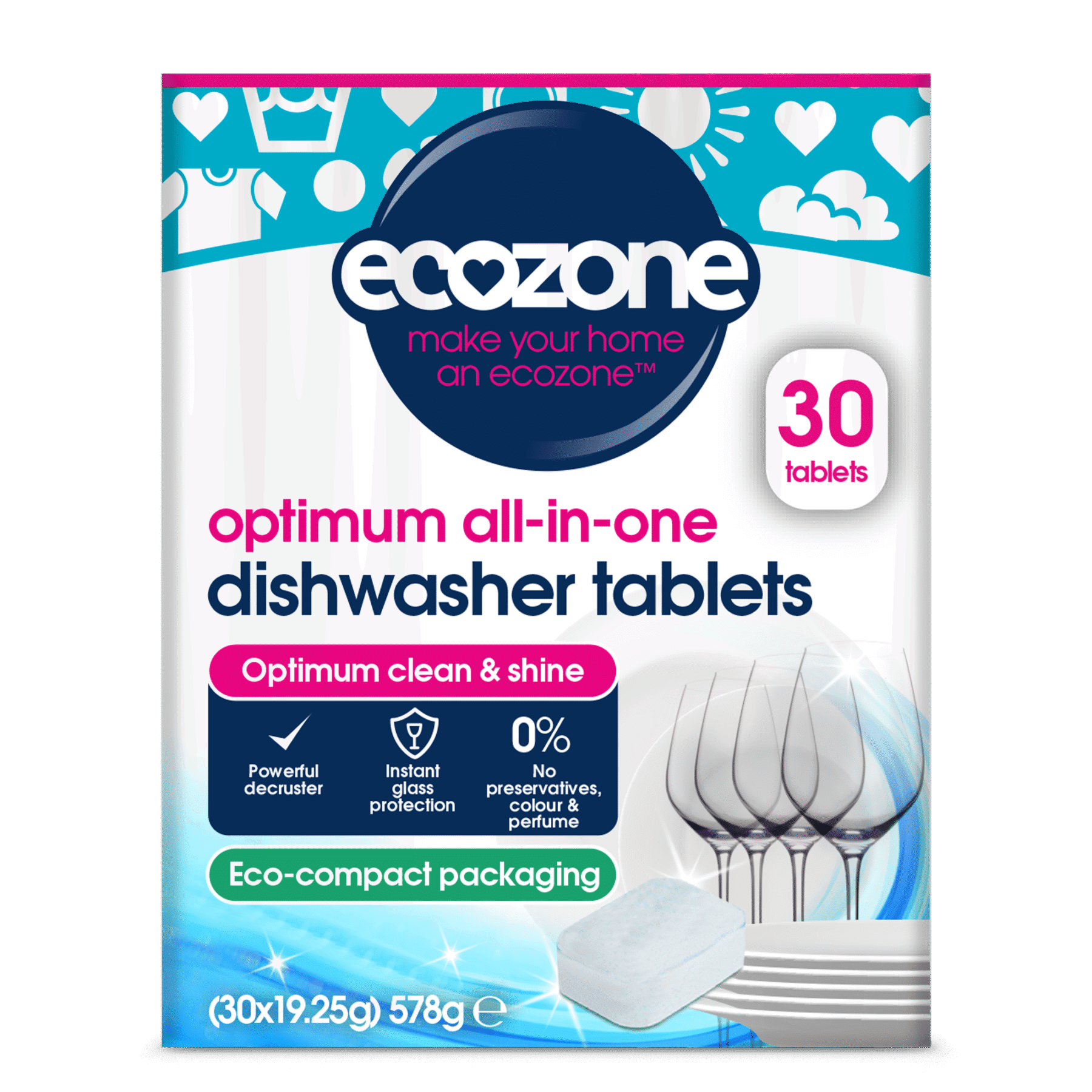 Experience the ultimate clean and shine with Ecozone optimum all-in-one dishwasher tablets. The all-in-one formula provides a deep clean and leaves a brilliant shine thanks to its powerful decrusting & degreasing action. With an extra dry effect and added glass protection, Ecozone optimum all-in-one dishwasher tablets leave sparkling results even at low temperatures.